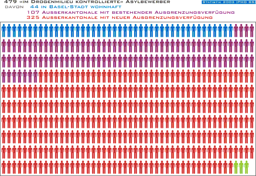 Anwendung in Basel (Jan. 2000 - Apr. 2004) Wer die Legitimität eines Gesetzes bejaht, mit welchem das Grundrecht auf Bewegungsfreiheit schon auf blossen Verdacht hin eingeschränkt werden kann, sollte wenigstens äusserste Sorgfalt walten lassen, wenn es darum geht, einen Verdacht zu konkretisieren. So basieren die erwähnten Bundesgerichts-Urteile auf dem Zusammentreffen mehrerer Verdachtsgründe. Basel-Stadt geht hier einen Schritt weiter und spricht gleich einmal einen Generalverdacht gegen eine ganze Bevölkerungsgruppe aus: wenn sich junge, schwarze Asyl Suchende in Quartieren aufhalten, in welchen sich auch Drogen Konsumierende bewegen, reicht dies den Behörden bereits aus, um einen «begründeten Verdacht» zu konstruieren. Dass es sich hierbei um genau diejenigen Basler Quartiere handelt, in welchen überdurchschnittlich viele Asyl Suchende untergebracht sind, ist ein unbedeutendes Detail... |
