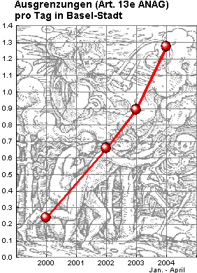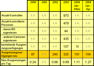 Ausgrenzungen Offizielle Statistiken sucht man vergebens, Doch dann und wann gelangt das Polizeidepartement mit «Erfolgsmeldungen» an die Öffentlichkeit. So ist z.B. der Medienmitteilung «Basel hat keinen Platz für dealende Asylbewerber» vom 28.01.04 zu entnehmen, dass praktisch alle Asyl suchenden und nicht dem Kanton Basel-Stadt zugewiesenen Afrikaner, welche in «einschlägigen» Quartieren kontrolliert wurden, eine Ausgrenzungsverfügung erhielten: «Die Kantonspolizei Basel-Stadt hat in den letzten neun Monaten des vergangenen Jahres im Rahmen einer speziellen Aktion rund 970 Personenkontrollen bei sich im Drogenmilieu aufhaltenden Schwarzafrikanern durchgeführt. Sie betrafen 479 verschiedene Personen. Davon waren 44 als Asylbewerber dem Kanton Basel-Stadt zugewiesen; alle anderen 435 kamen aus einem anderen Kanton. 131 Personen wurden festgenommen, und gegen die restlichen Auswärtigen eine Ausgrenzung verfügt. 107 Schwarzafrikaner hielten sich trotz verfügter Ausgrenzung wiederholt in Basel auf und wurden teils bis zu neunmal aufgegriffen. Alle Verstösse wurden an das Strafgericht verzeigt.» |