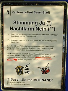 Ruhe am Rhein! An einem lauen Frühlingsabend Ende Mai 2004 sitzt Ringo Drömmeli mit einigen Freunden am Kleinbasler Rheinufer auf der Treppe vor der Kaserne. Rundherum viel Betrieb, Boule-Kugeln klicken, Buvette-Gäste trinken, lachen und diskutieren und Scharen von flanierenden SpaziergängerInnen wollen das urbane Leben auskosten. Dass Ringo Drömmeli und sein Freund Guschti Klampfe die Stimmung in Musik umsetzen und zur Erbauung der Anwesenden ein Gitarre - Conga Duett zum Besten geben, ist der kulturelle Sahnetupfer des Abends. Wenige Tage zuvor hat die Basler Polizei angekündigt, dass man nächtliches Musizieren auf Allmend verschärft als Nachtruhestörung zu ahnden gedenke. Die Zeit verstreicht viel zu schnell,- der Zeiger rückt auf 22 Uhr vor. Die Zuhörerschaft applaudiert, die Spielleute gewähren geschmeichelt eine Zugabe. Mitten im Publikum ein betont unauffällig sportlich leger gekleideter Herr mittleren Alters mit Knopf im Ohr, unschwer als Polizist in Zivil erkennbar, tritt einige Schritte zurück und avisiert seine Kollegen. Nun, er hätte ja seinen Ausweis zücken und die Musiker auffordern können, die Instrumente wegzulegen. Die Dramaturgie scheint jedoch nicht vorzusehen, die rechtlich seit 5 Minuten bestehende Nachtruhestörung zu unterbinden ... hier muss mit grosser Kelle angerührt werden! Als einige Minuten später ein Streifenwagen auftaucht, outet sich der Undercover-Agent und schnauzt die Musikanten an. Der Gitarrist verstaut sein Instrument sofort im Koffer, währenddem sich Ringo Drömmeli auf eine Diskussion mit den Vertretern des Staates einlässt. Vielleicht wäre es besser gewesen, er hätte sich mit schuldbewusst gesenktem Haupt weggeschlichen ... so aber kommt es, wie es kommen musste. Erst Ausweiskontrolle, dann Sicherstellung des Tatwerkzeugs gemäss Polizeigesetz § 52 und § 53. Zwei Uniformierte mühen sich ab, die Congas - nicht etwa billige 08/15-Modelle, sondern erlesen edle Exemplare - in das Polizeiauto zu quetschen. Ringo Drömmeli erhält eine Quittung über «2 Bongo Trummeln» (Sicherstellungsgrund: «Lärm nach 22 Uhr») und wird stehen gelassen. |